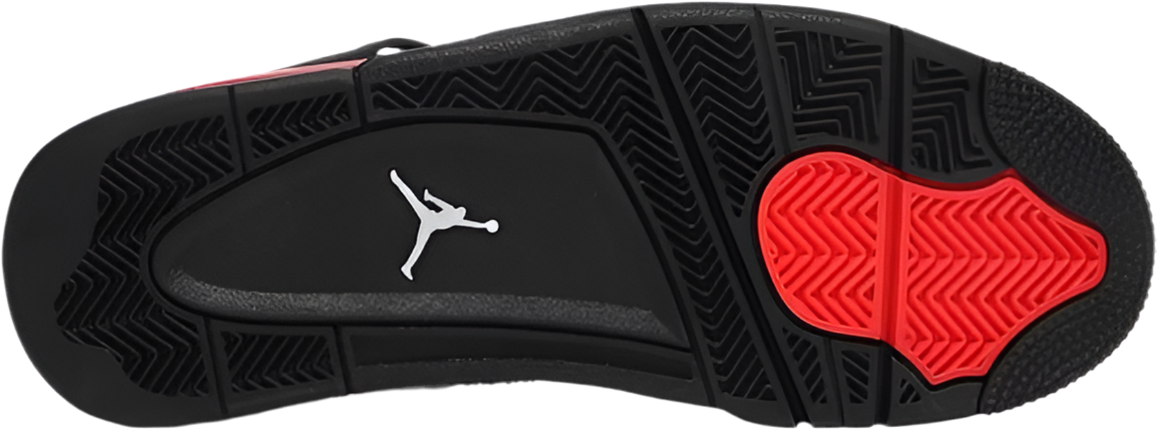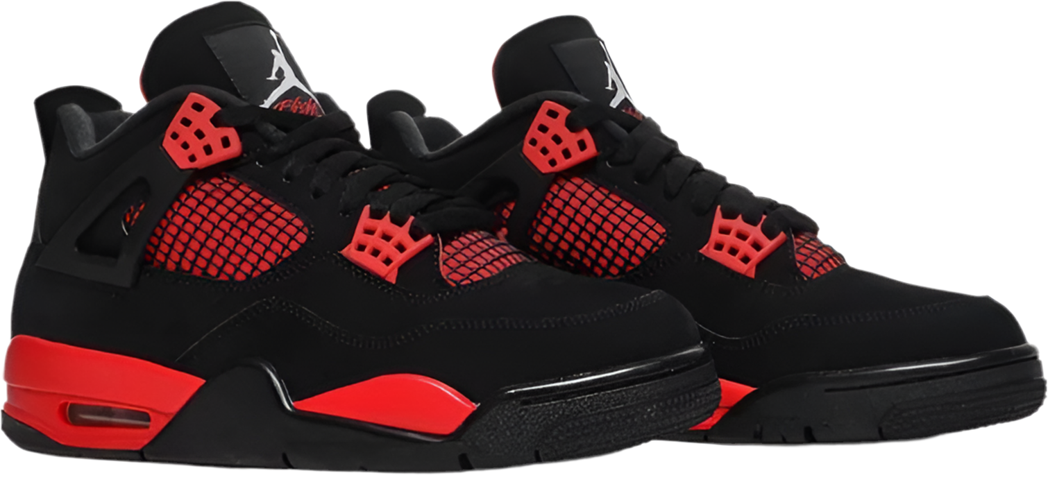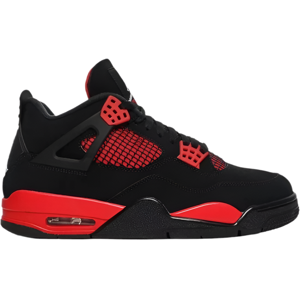 The Air Jordan 4 Retro ‘Red Thunder’, also known as 'Crimson', features familiar color blocking that recalls the coveted ‘Thunder’ colorway, originally released in 2006 and subsequently reissued in 2012. The mid-top sports a black nubuck upper with contrasting pops of crimson in lieu of the older shoe’s Tour Yellow accents. They appear on the sneaker’s molded eyelets, interior tongue, quarter panel, throat and midsole, which packs visible Air-sole cushioning under the heel. Jumpman branding decorates the tongue tag and heel.
