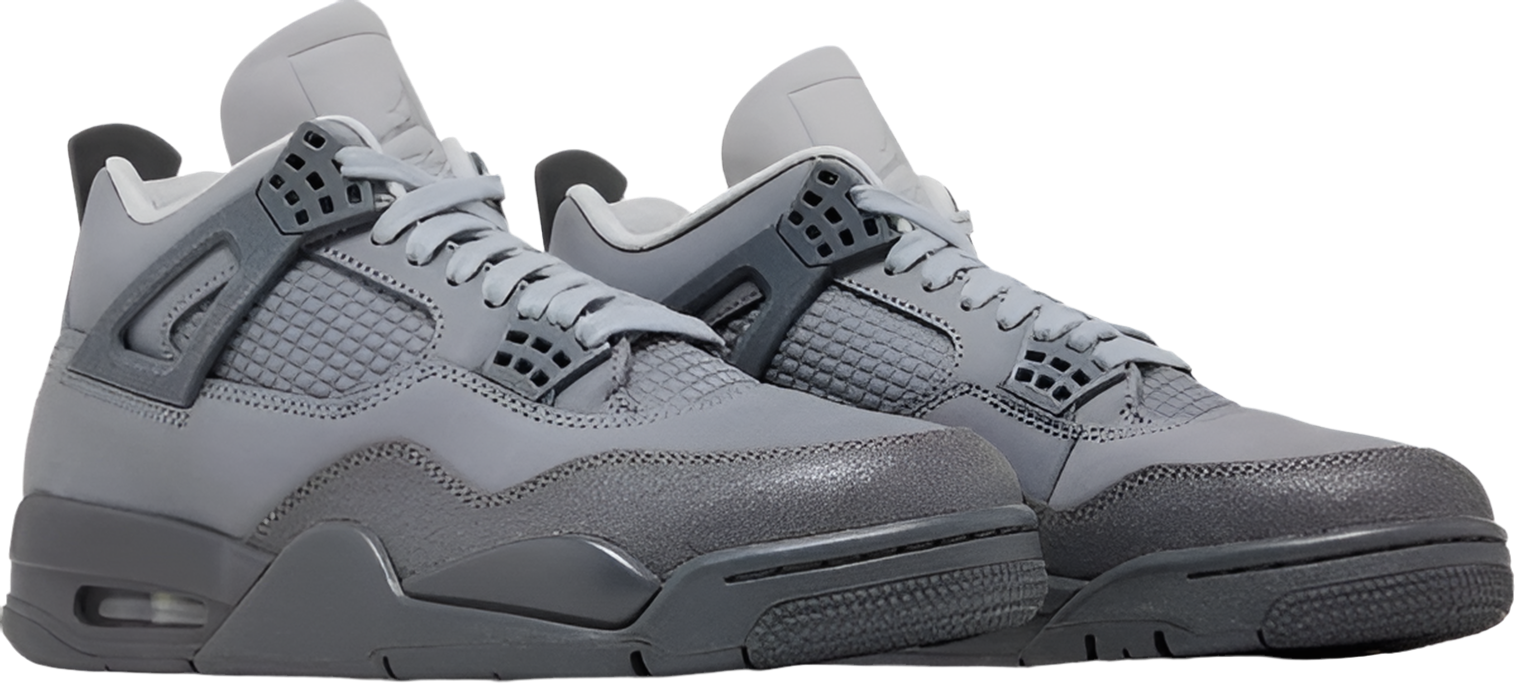 The Air Jordan 4 Retro SE 'Wet Cement' also known as 'Paris Olympics' drapes the classic silhouette in a neutral monochrome design in honor of the 2024 Summer Olympics. Varying shades of grey are applied to the nubuck upper, featuring a suede forefoot overlay and a debossed grid pattern on the quarter panel. Speckled detailing covers the TPU support wings and molded back tab, marked with a raised Jumpman icon. A second Jumpman logo decorates the tongue. The sneaker sits atop a dark grey polyurethane midsole with visible Air-sole cushioning in the heel.