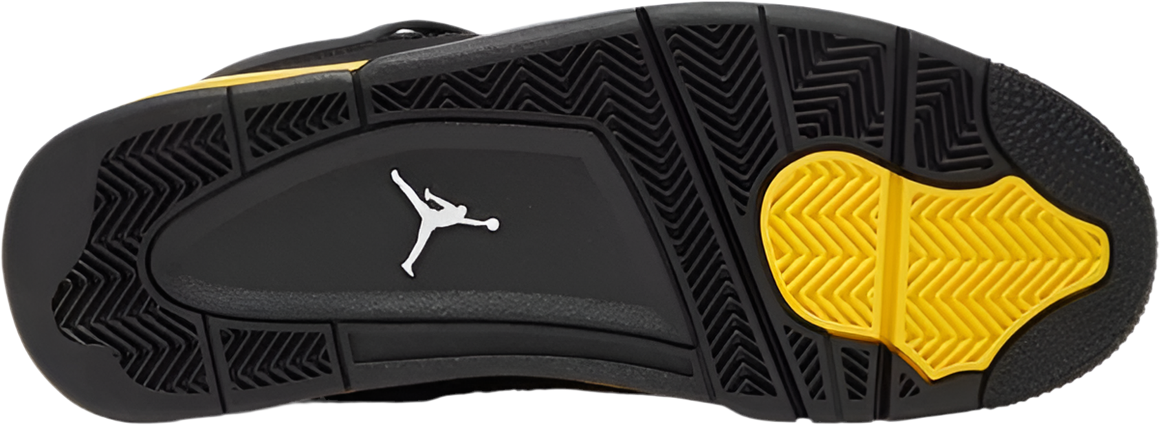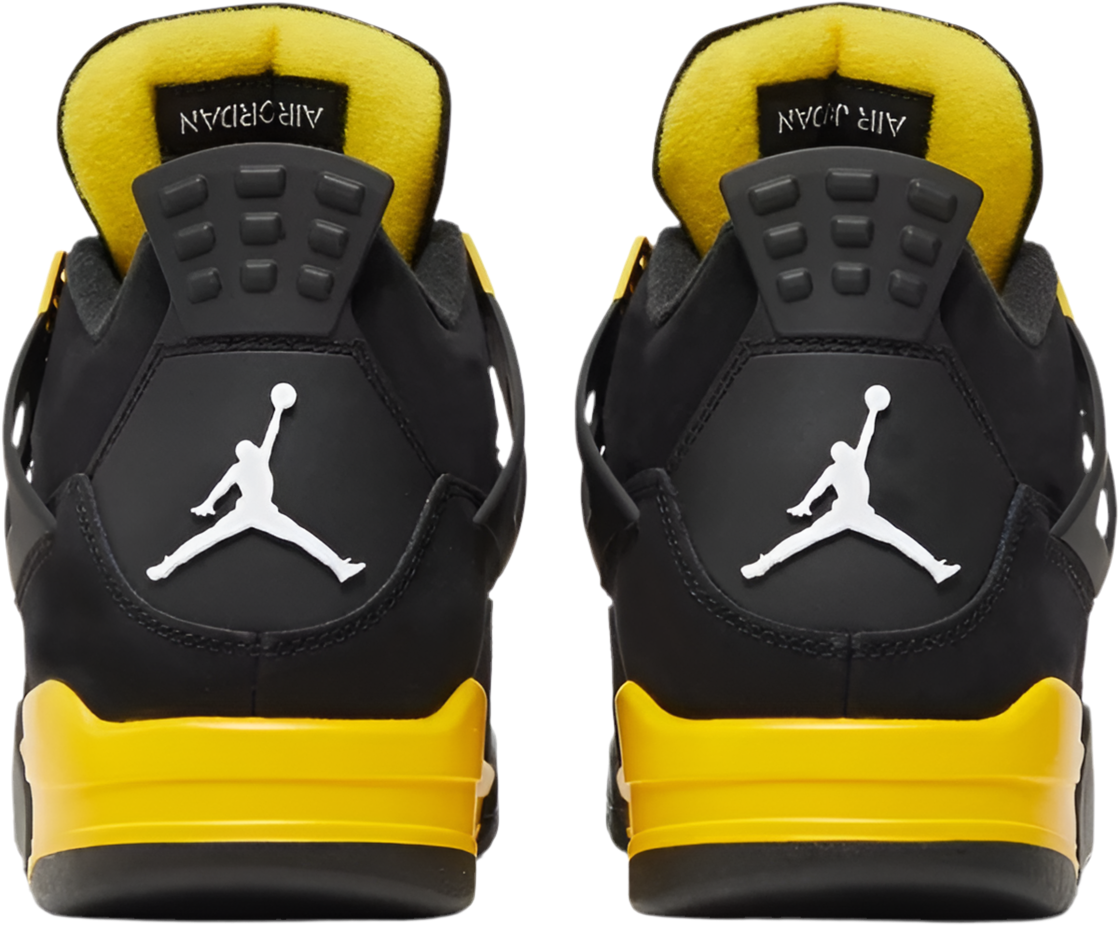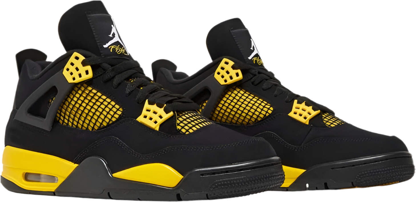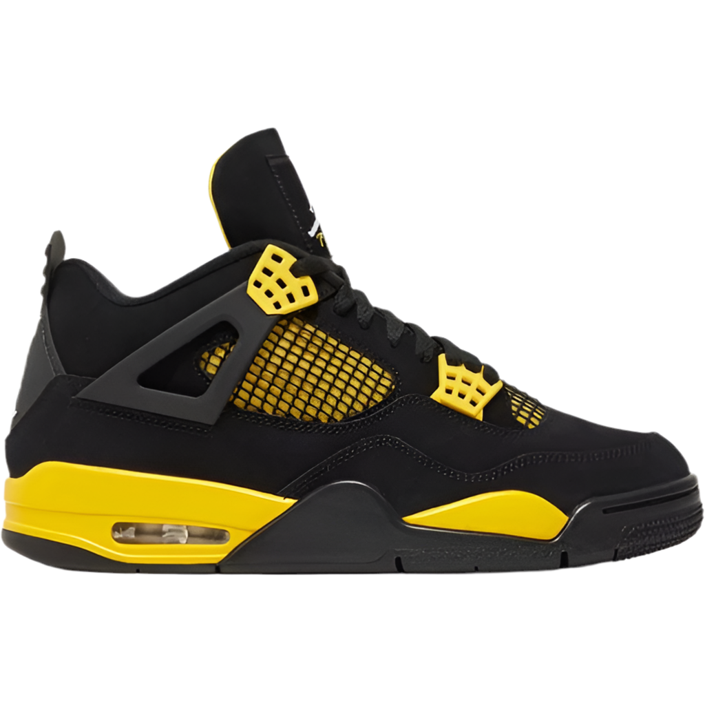 The 2023 edition of the Air Jordan 4 Retro ‘Thunder’ brings back the coveted colorway originally released in 2006 (and previously reissued in 2012). The upper is draped in smooth black nubuck, contrasted by hits of yellow on the molded eyelets, quarter panel, and lower tongue, with the latter two components covered in black netting. Jumpman branding appears on the Flight tongue tag and molded heel tab. Lightweight cushioning comes courtesy of a yellow polyurethane midsole, enhanced with an exposed Air-sole unit in the heel.