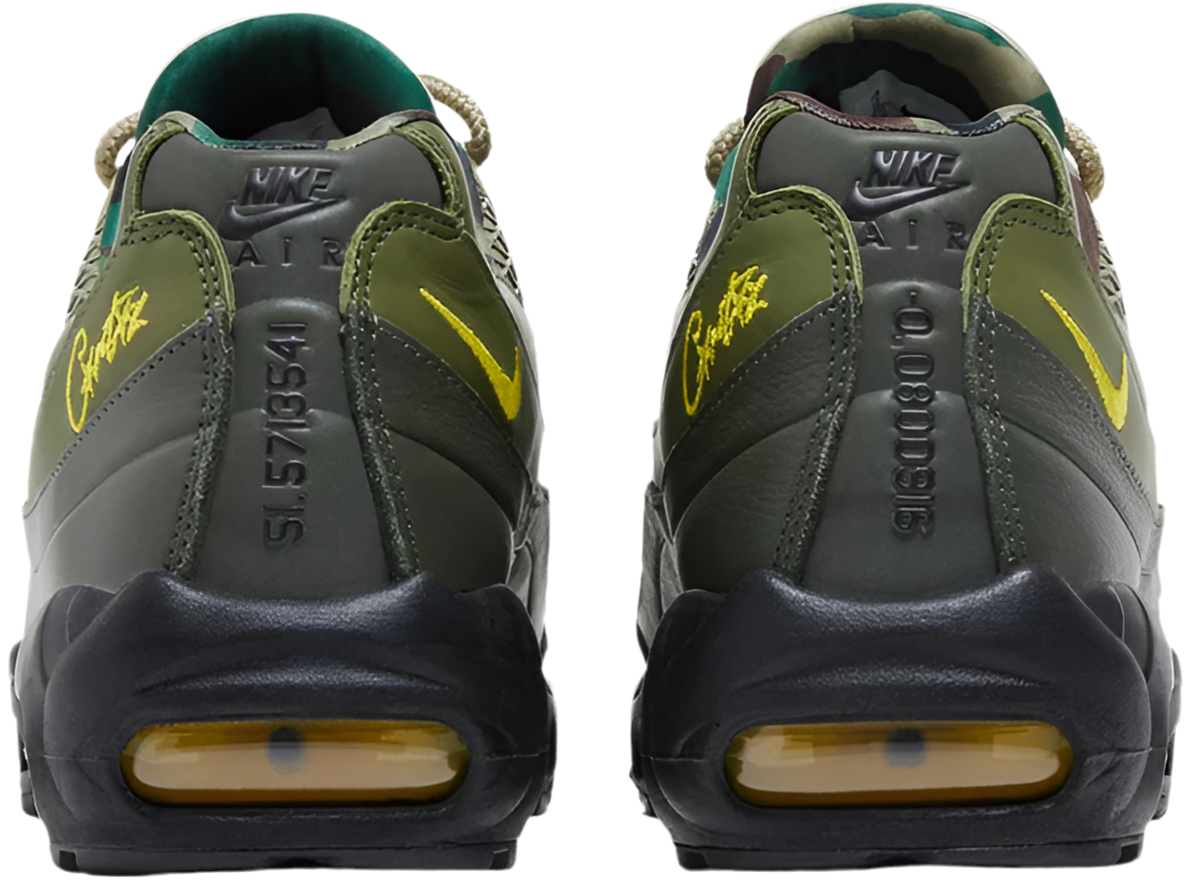 Designed in conjunction with the London-based streetwear brand, the Corteiz x Nike Air Max 95 SP ‘Rules the World - Sequoia’ makes over the retro running shoe with refreshed materials and a military-inspired color palette. Gradient olive green tones are executed on the upper, featuring a netted base with wavy leather side panels. Embroidered Corteiz branding adorns the lateral forefoot and heel, while the label’s Alcatraz logo graces the tongue patch. Lightweight cushioning arrives via a blacked-out polyurethane midsole, contrasted by exposed Air-sole units tinged in yellow.