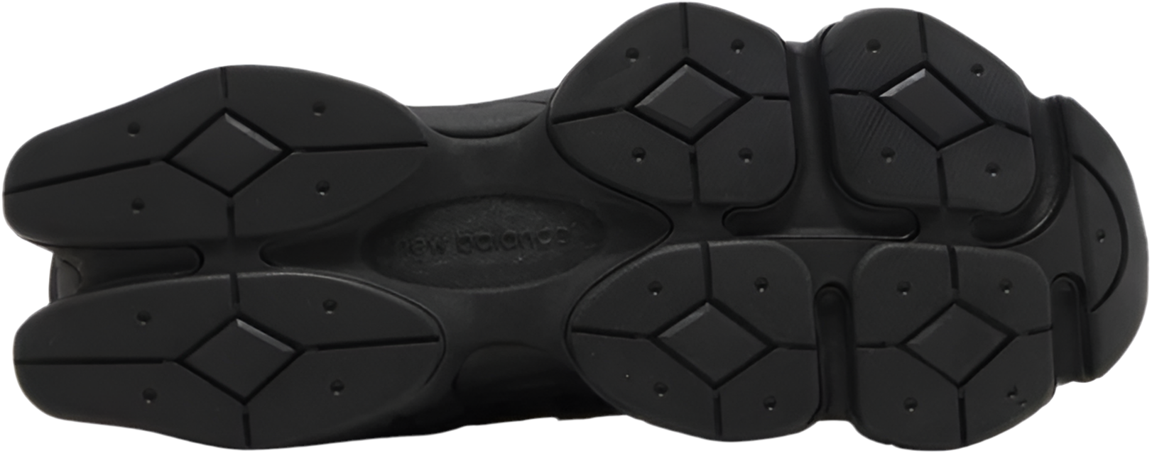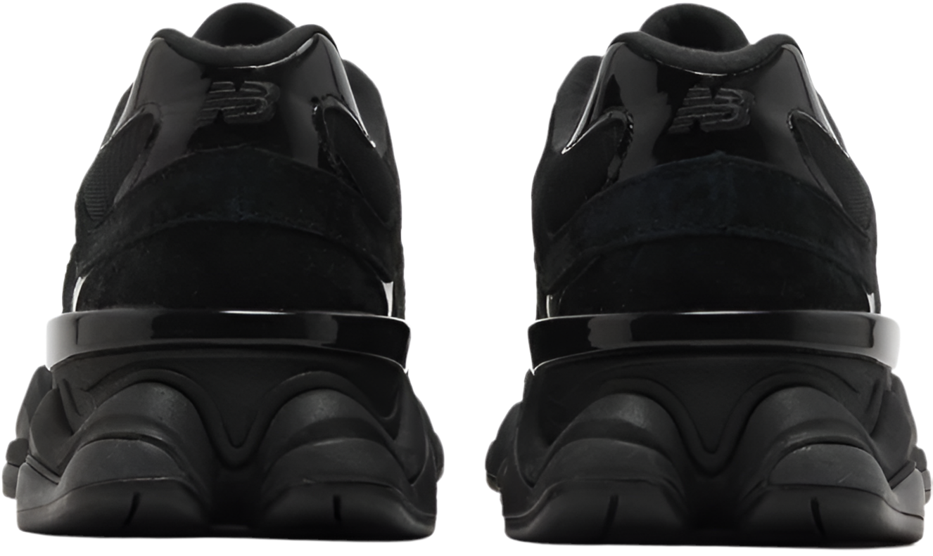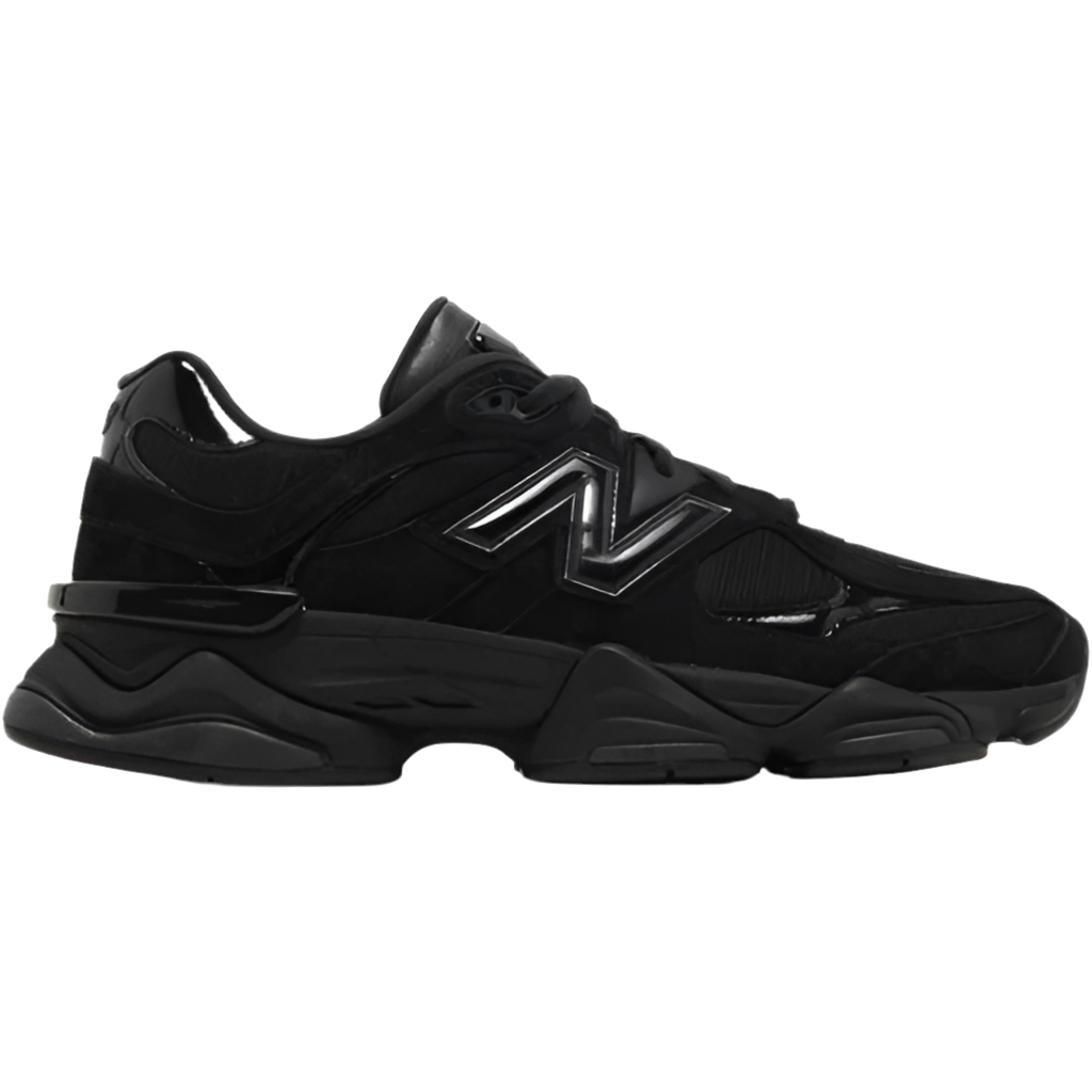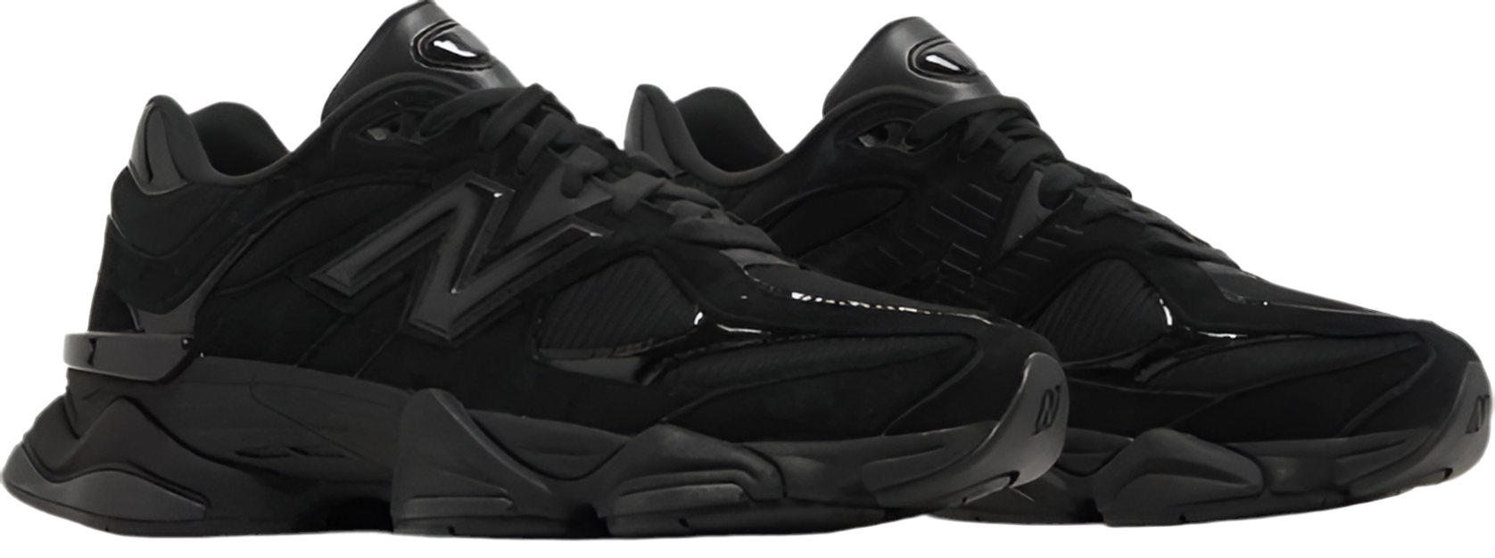 The New Balance 9060 'Triple Black Suede Patent' features a breathable mesh base with durable suede overlays. Glossy patent leather detailing is utilized on the forefoot overlay, lateral 'N' logo and back tab, marked with embroidered NB branding. Lightweight cushioning arrives via a double-stacked ABZORB midsole, painted black and supported by a diamond-pattern rubber outsole.