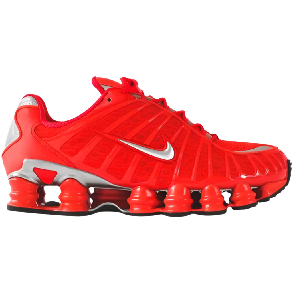 Released in 2019, the Nike Shox TL 'Speed Red' has a bright red mesh upper with a full length foot cage and patent leather overlays. Metallic silver hits land on the upper, including on the small midpanel Swoosh, eyelets, heel patch and collar. The chunky silhouette is grounded by the Nike Shox columns, which features 12 Pebax plates with foam in between for excellent energy return on every step.
